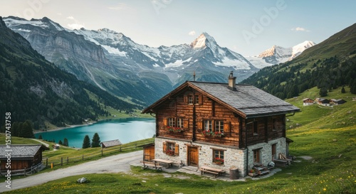 A rustic wooden chalet nestled in a verdant valley, overlooking a serene turquoise lake and snow-capped mountains