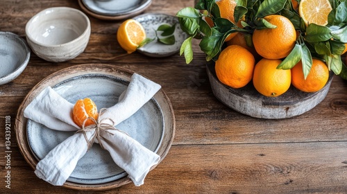 A rustic wooden table featuring mismatched ceramic plates, linen napkins tied with twine, and a centerpiece of fresh citrus fruits