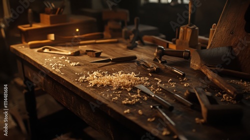 a rustic wooden workbench covered with hand tools like hammers, chisels