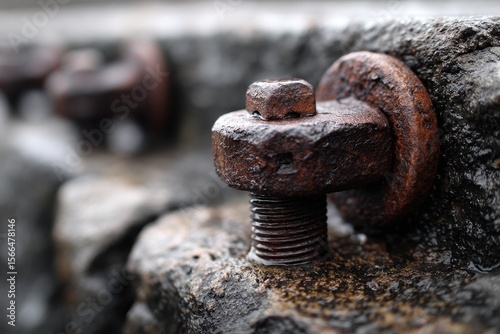 A rusty bolt and nut sitting on top of a rock