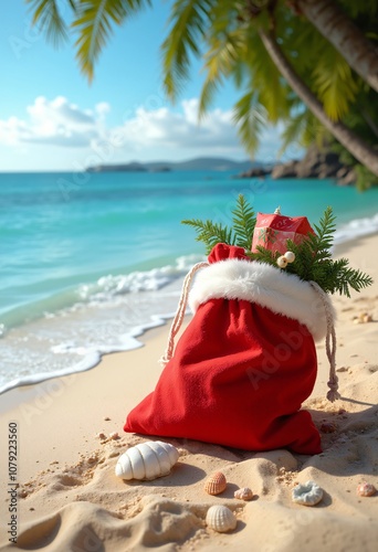 A sack full of Santa's gifts is forgotten on the ocean shore on the warm southern sand under palm leaves in the heat of the holiday. Have a successful vacation and happy finds. Hot Christmas in the t