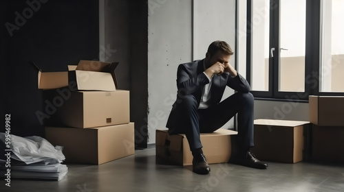 a sad man sitting with his personal belongings on the floor and feeling depressed after losing his job