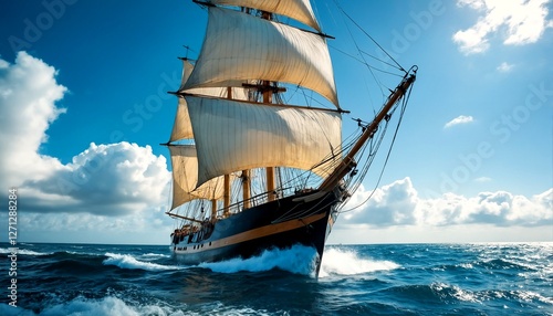 a sailing ship with billowing sails on the open ocean.