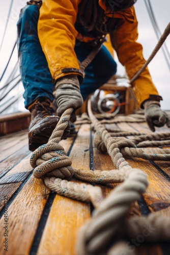 A sailor's hands meticulously working a nautical rope on a wooden ship's deck.
