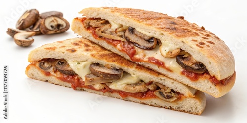 A savory grilled flatbread sandwich filled with melted cheese and sauteed mushrooms, a delightful culinary creation