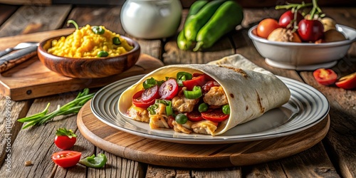 A savory tortilla wrap filled with seasoned chicken, vibrant green peppers, cherry tomatoes, and a touch of yellow sauce, resting on a wooden surface, alongside a bowl of bright yellow mashed peas