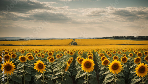A scene of serene perfection unfolds in an idyllic sunflower field, where rows of towering yellow blooms stand as nature's testament to beauty and tranquility - AI Generative