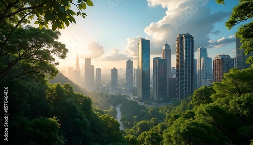 A scenic view of a city skyline surrounded by dense greenery during sunset