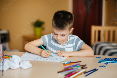 A school-age boy does homework at home. Training at school