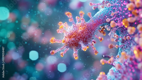 A scientific illustration of a virus under a microscope, showcasing its complex form and surface proteins with precise accuracy