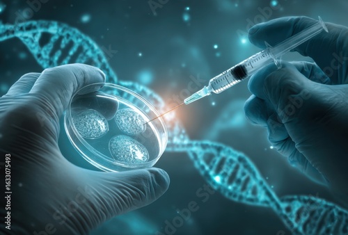 A scientist meticulously injects a substance into cells within a petri dish, symbolizing advancements in medical research and genetic modification.