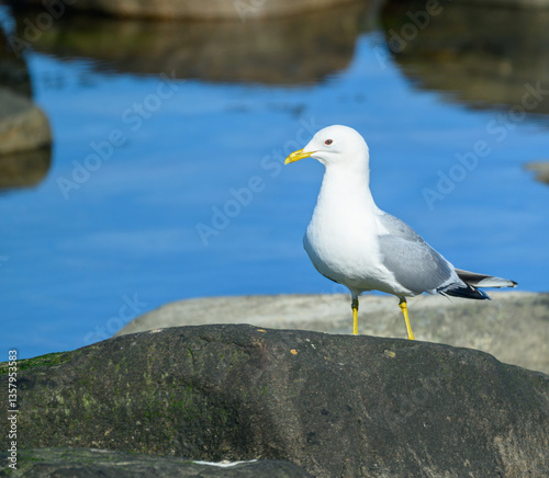 A seagull perches on a large rock beside still water, surrounded by smooth stones. The bird looks alert and ready to take flight under the clear blue sky