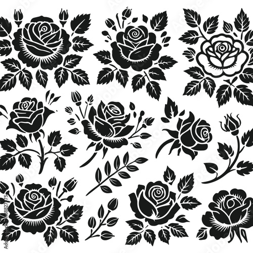 A seamless pattern featuring various stylized rose silhouettes in black ink against a white background.