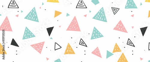 A seamless pattern of colorful hand-drawn triangles on a white background. The triangles are in various sizes and have different patterns and textures, creating a playful and modern design.