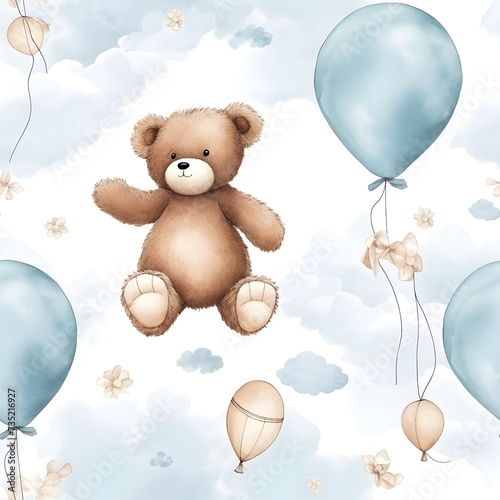 A seamless pattern of cute teddy bear doll wallpaper watercolor illustration design on white background. Generative AI