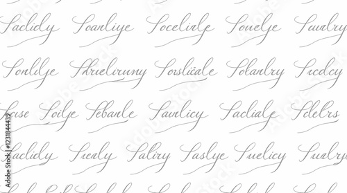 A seamless pattern of elegant calligraphy script in a delicate cursive font, written in shades of grey on a white background, creating a sophisticated, understated aesthetic with a bal.