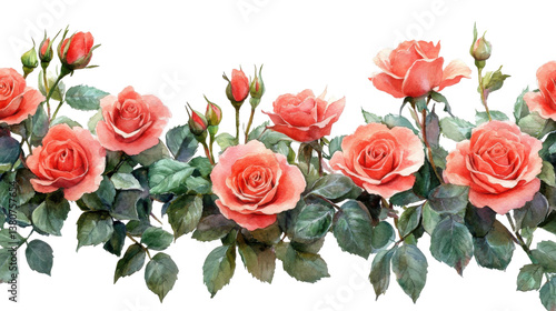 A seamless watercolor pattern features a continuous arrangement of delicate peach and pink roses with green leaves and stems on a transparent background.