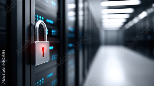 A secure data center with server racks and a padlock symbolizing cybersecurity and data protection.