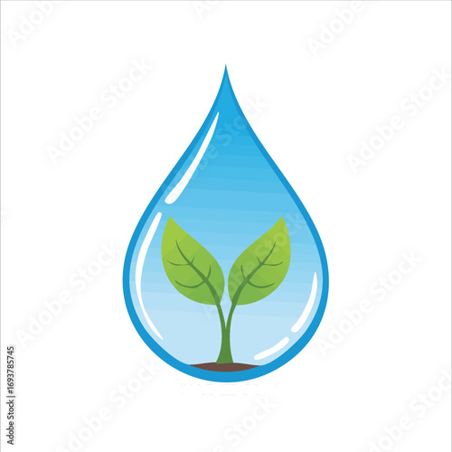 A seedling sprouts within a vibrant blue water droplet, symbolizing growth and hydration.