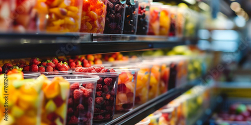 A selection of pre packed fruit containers on display, featuring strawberries, raspberries, and diced mango, ideal for grocery or healthy lifestyle imagery.