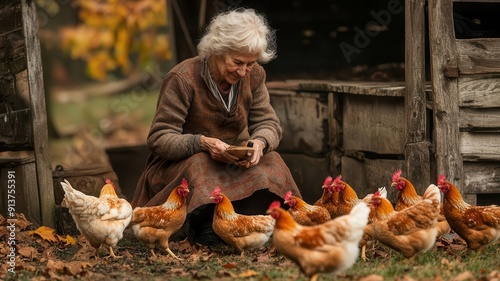 A senior woman interacting lovingly with her chickens in a rustic setting, enjoying a peaceful moment on the farm.