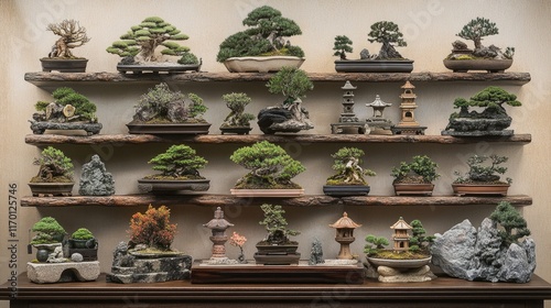 A serene arrangement of bonsai trees on a display shelf, surrounded by decorative rocks and miniature sculptures.