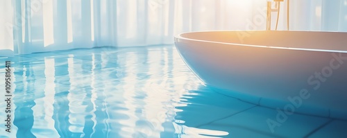 A serene bathroom scene featuring a modern bathtub and tranquil water reflections.
