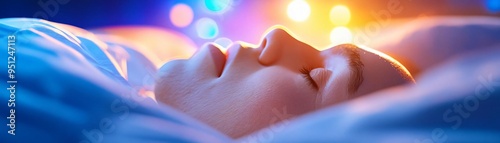 A serene close-up of a peaceful face resting, illuminated by soft, colorful lights, evoking tranquility and relaxation.