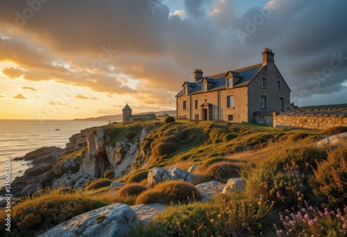 A serene coastal manor bathed in golden sunset light standing proudly with a vast ocean view under a dramatic cloudy sky