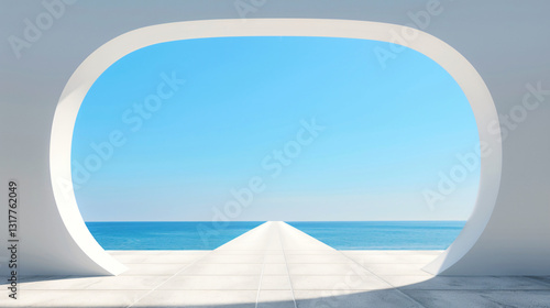 A Serene Coastal Vista Framed by Minimalist Architecture An Oval Window Reveals a Tranquil Ocean