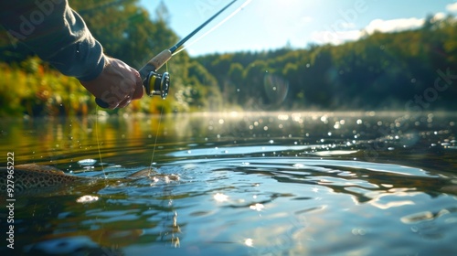 A serene fishing scene captures a close-up of a person casting a line into tranquil waters. The glistening surface reflects the calm environment. Perfect for nature lovers. AI
