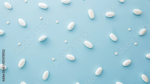 A serene, flat lay of white oval shapes scattered across a soft blue background, creating a minimalist aesthetic.