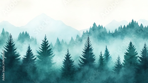 A serene forest landscape with misty mountains, featuring lush green trees and a tranquil atmosphere, perfect for nature themes.