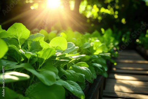 A serene garden scene showcasing vibrant green leaves basking in warm sunlight, perfect for nature and wellness themes.