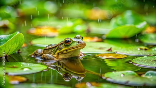 A serene green frog rests amidst glistening lily pads, a gentle rain showering the tranquil aquatic scene.