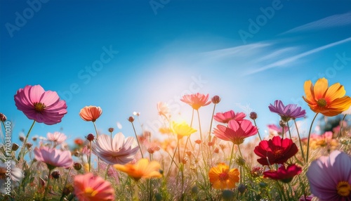 A Serene Illustration Of Colorful Flowers Swaying In A Gentle Breeze Basking Under Soft Sunlight Against A Clear Blue Sky