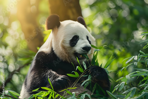 A serene image of a giant panda eating bamboo in a lush, green forest with sunlight filtering through the trees.