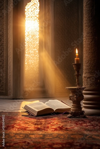 A serene indoor scene featuring a candlelit book on a rug, bathed in sunlight shining through an open doorway