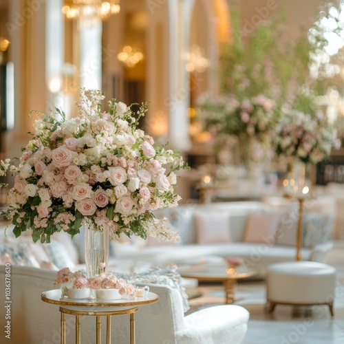 A serene indoor setting featuring delicate floral arrangements and soft pastel decor, creating a calming atmosphere