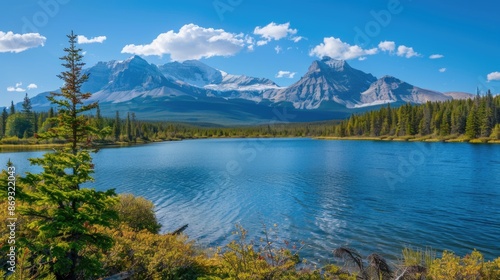 A serene lake surrounded by lush greenery and a majestic mountain in the background, perfect for travel or outdoor adventure use
