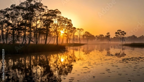A serene landscape at dawn, featuring a misty wetland with still water reflecting the soft