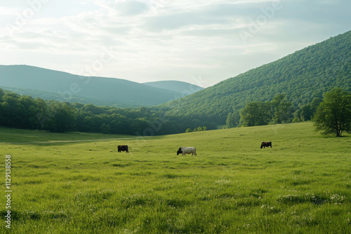 A serene landscape featuring cows grazing in a lush green field surrounded by hills.