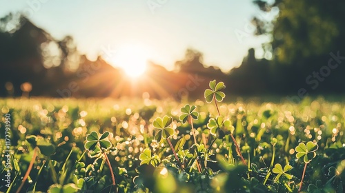 A serene landscape featuring vibrant clover in sunlight.