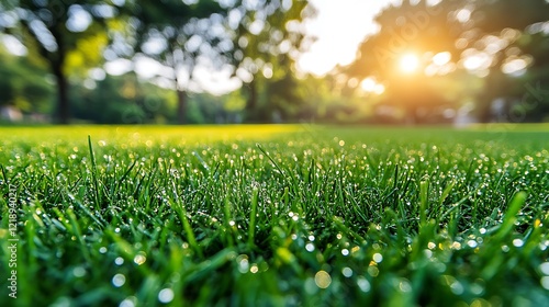 A serene meadow at dawn, with soft light illuminating the dewdrops on grass.