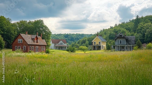 A serene meadow with vintage houses in the background, nestled in a peaceful countryside valley, showcasing the rustic beauty of rural architecture.