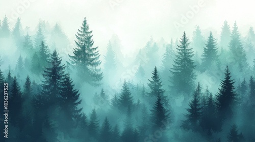 A serene misty forest filled with green pine trees and a soft fog. The atmosphere evokes tranquility and calmness in nature's embrace.