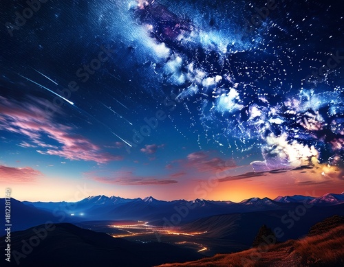 a serene night landscape showcases a mountainous region under a starlit sky filled with the milky way