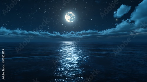 A serene night scene featuring a full moon illuminating the ocean surface.