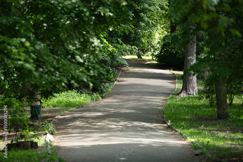 A serene pathway meanders through vibrant greenery in a park during springtime. Sunlight filters through the trees, creating a peaceful ambiance for leisurely walks
