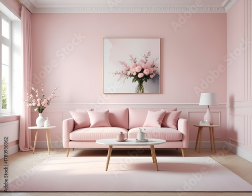 A serene pink living room featuring a floral painting, cozy sofa, and elegant decor, creating a calm and inviting atmosphere.